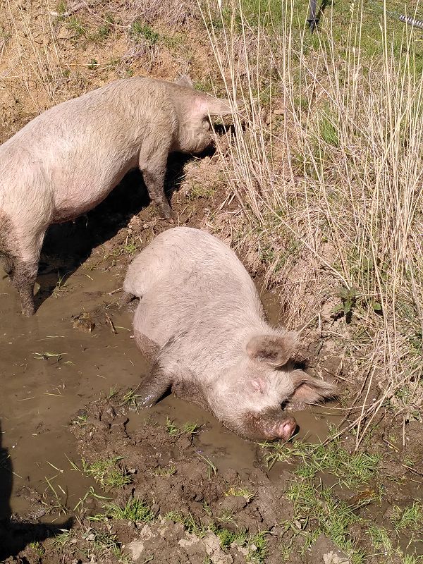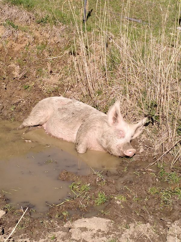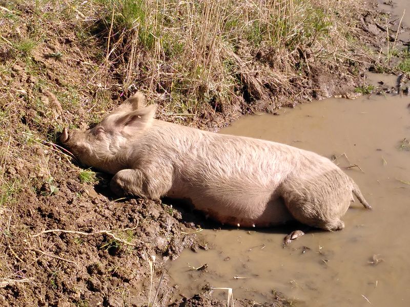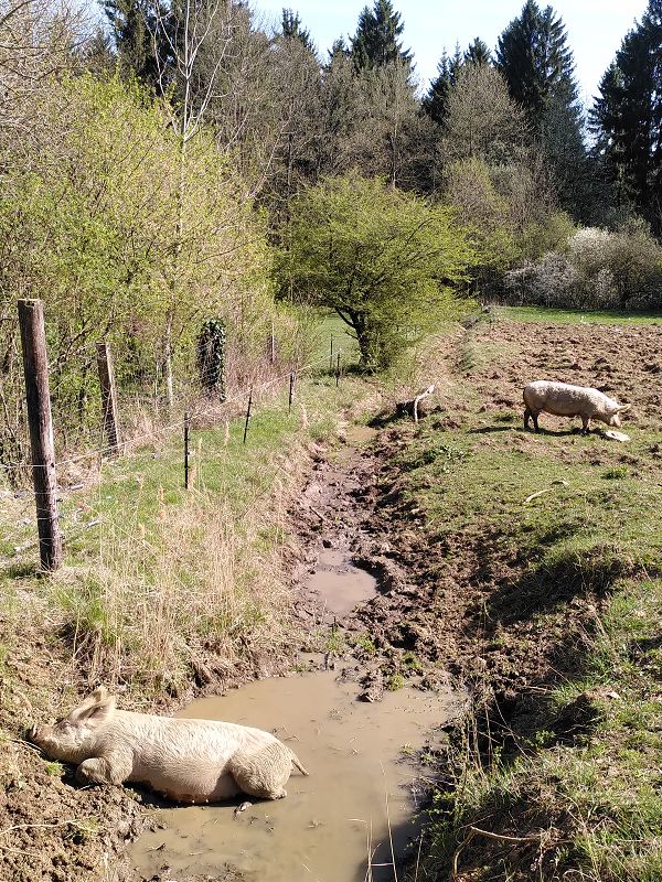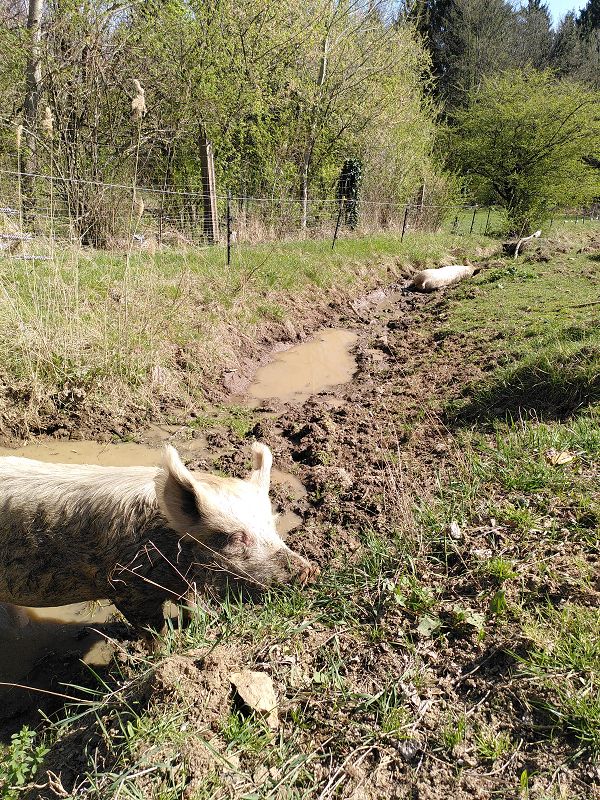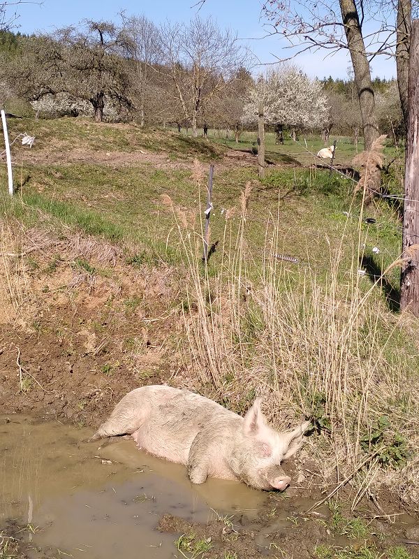 Auf eine schöne Winterlandschaft folgt mit zunehmenden Temperaturen meist ein matschiger, wenig sehenswerter Frühlingsbeginn. Besser wird’s, sobald das Gras zu wachsen beginnt und die Schweine die Badesaison eröffnen… 😊