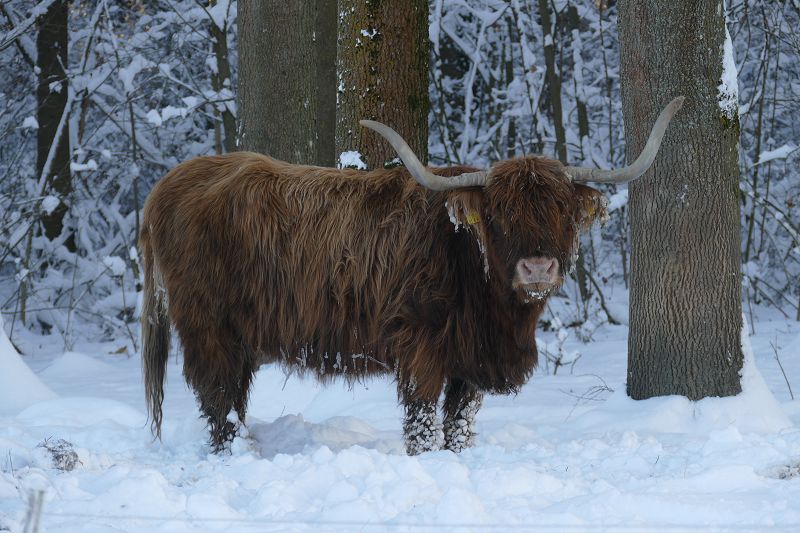 Rosi hingegen ist in den Wald spaziert und steht dort eindrucksvoll unter den Bäumen. Cindy beobachtet das Geschehen an den Raufen ebenfalls aus einiger Ferne:
