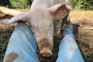 Streicheleinheiten sind FEE suspekt, sie schaut bestenfalls dabei zu, wenn sich andere Schweine den Bauch kraulen lassen. Ich habe mich daher am 24. Dezember 2016 wirklich sehr gefreut, als ich auf der Weide neben einem anderen Schwein hockerlte und sie plötzlich ihren Kopf unter meinem linken Arm durchschob und auf mein Knie legte – das hat sie noch nie gemacht!!