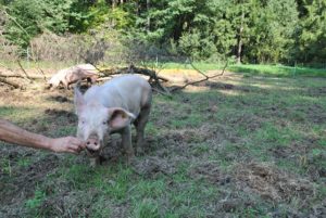 In der Tat ist FEE das einzige unserer Schweine, dass, wenn es um Futter geht, eine gewisse Überlegtheit an den Tag legt. Konkret heißt das, dass sie es nicht auf Konfrontationen mit ranghöheren Schweinen anlegt, ihnen sogar meistens diplomatisch den Vortritt lässt und sich, während alle anderen Schweine bei der Futterquelle (= mir) am Zaun stehen, im Hintergrund seelenruhig daran macht, das Futter zu knabbern, das dort bereits liegt. Sie lässt sich durch neu hinzukommendes Futter also nicht ablenken, ganz im Gegensatz zu den anderen Schweinen – während die um den neuesten Happen rangeln, sammelt sie im Hintergrund alle übrigen ein!